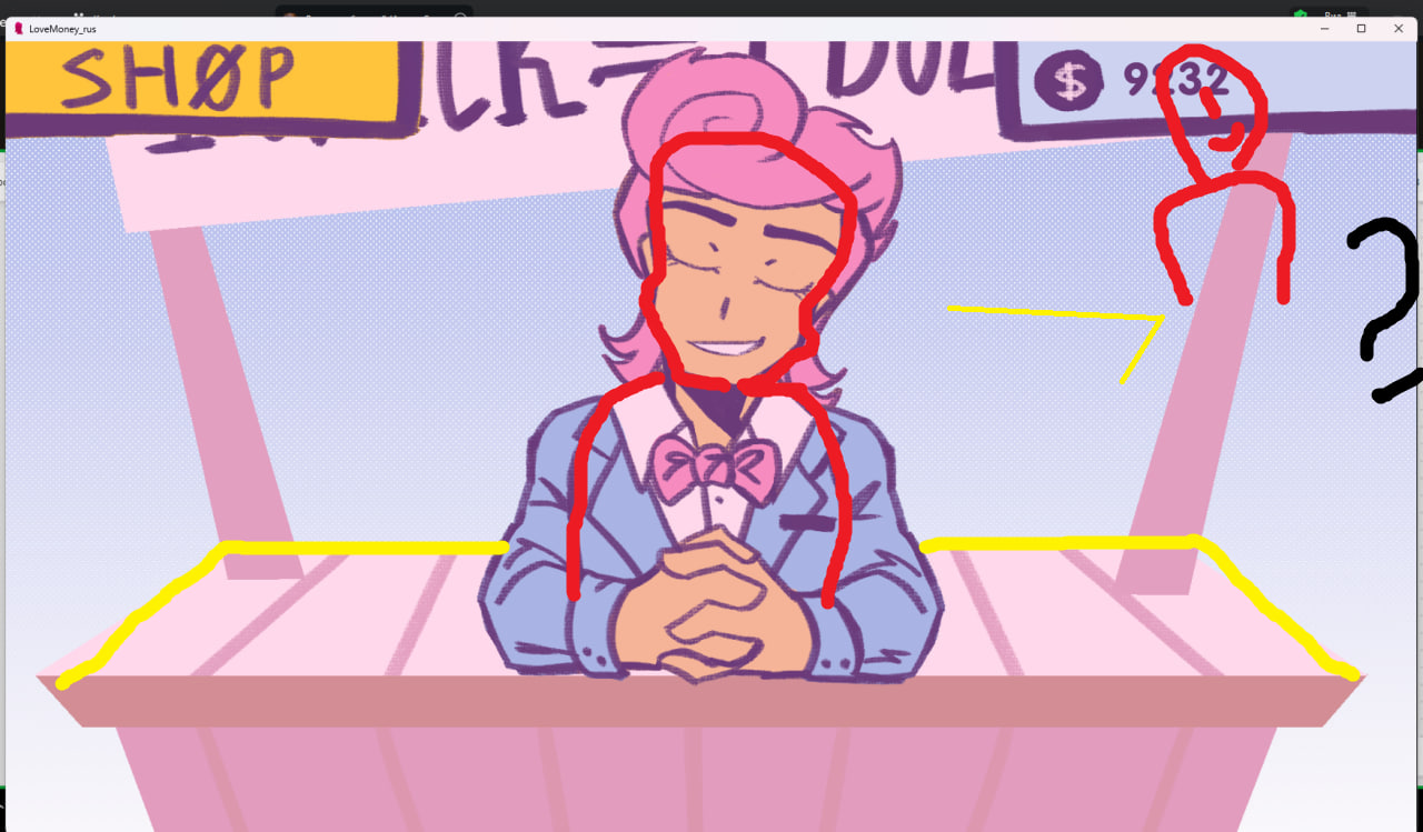 и таак, в этой игре, как и в оригинальной есть ошибки в скрипте и сюжетные дыры, а так же ошибки в самой рисовке начнем с самого простого: рисовка и так, Харви и стойка находятся под разными углами. это ошибка в перспективе если посмотреть со стороны камеры, то это будет полутело Харви, летающее близко к стойке. изначально я думала, что там просто полутело приклеилось к стойке, но посмотрев на то, что они находятся под абсолютно разными углами я поняла, что посмотрев сбоку он летает